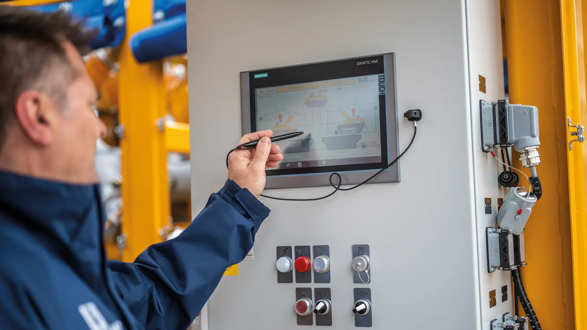 Auch in Sachen Digitalisierung glänzt die BE 600-C mit einigen neuen Features, erklärt Yilmaz Ipeksoy, Technischer Leiter BAUER MAT Slurry Handling Systems: So verfügt jede der beiden Einzelanlagen über ein 12-Zoll-Display mit Touchscreen. Die komplette Anlage kann im Master-Slave-Operation-Modus auch von nur einem Screen aus betrieben werden. Der Bediener sieht auf einen Blick, welche Teile der Anlage (Förderband, Durchflussmesser, Zubehör etc.) laufen und welche nicht; auch Drücke, Betriebsstunden oder die Stromaufnahme werden angezeigt. Ein EWON-Router stellt eine Verbindung mit dem Internet her, wodurch sich per Fernabfrage sämtliche Daten, aber auch Fehlermeldungen abrufen lassen. „So können sich unsere Service-Spezialisten schnell und unkompliziert mit dem Gerät verbinden und bei Bedarf eine Ferndiagnose durchführen. Das spart viel Zeit und damit auch Kosten, denn unsere Kunden müssen nicht warten, bis der Service-Techniker vor Ort auf der Baustelle ist.“